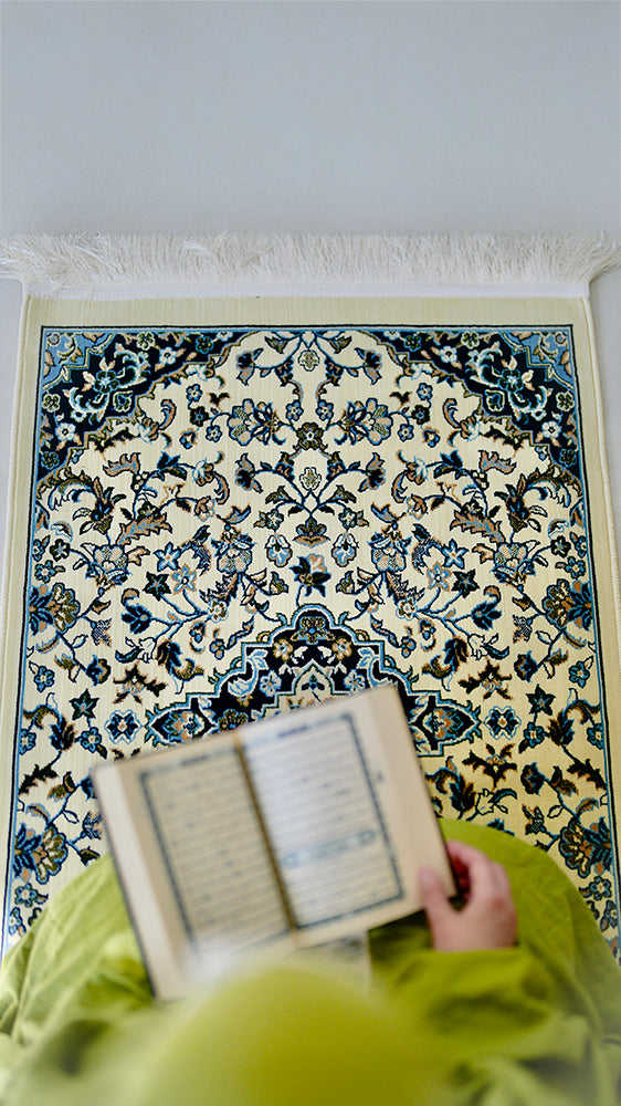 سجادة صلاة فردية بنقوش مستوحاة من سجاد الحرمين الشريفين والروضة الشريفة مصممة بعناية فائقة لتمنحك الراحة أثناء الصلاة مصنوعة بأعلى مواصفات الجودة في المملكة العربية السعودية